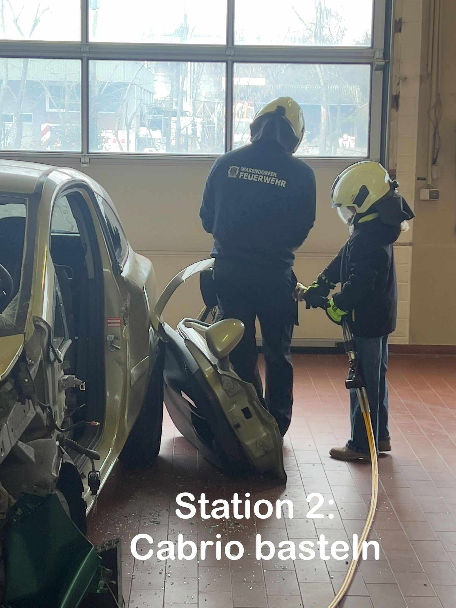 Bei der zweiten Station wurde es spektakulär. Mit Schere und Spreizer wurde ein Auto „zum Cabrio“ umgebaut. Hier konnten die Kinder erleben, wie hydraulische Rettungsgeräte arbeiten und mit welcher Kraft sie eingesetzt werden.